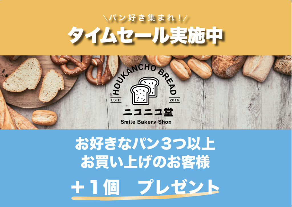 つきましては11月1日よりタイムセールは「パン3つ以上お買い上げのお客様にプラス1個をプレゼント」に変更させていただきます。誠に恐縮ですがご理解を賜りますようお願い申し上げます。